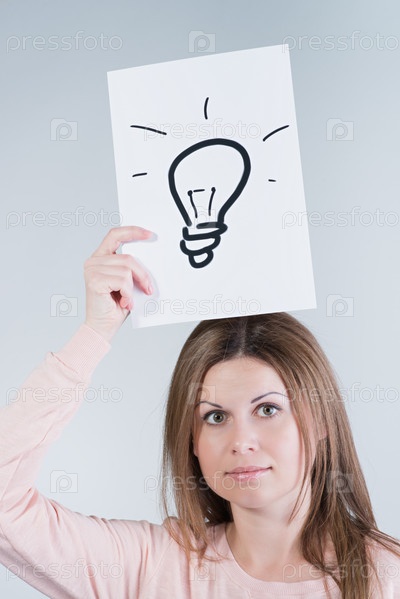 Женщина держит лист бумаги с нарисованной лампочкой