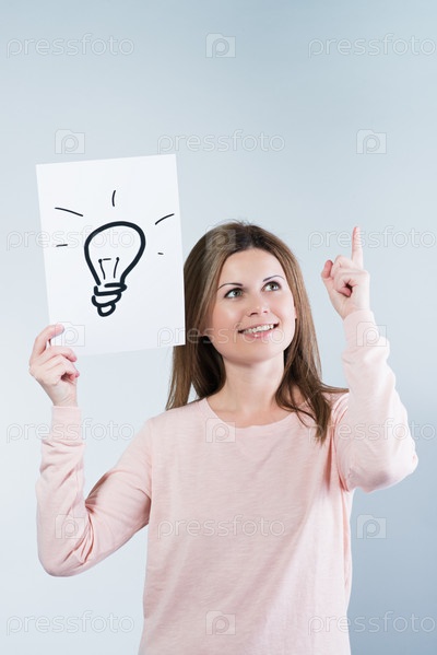 Женщина держит лист бумаги с лампочкой