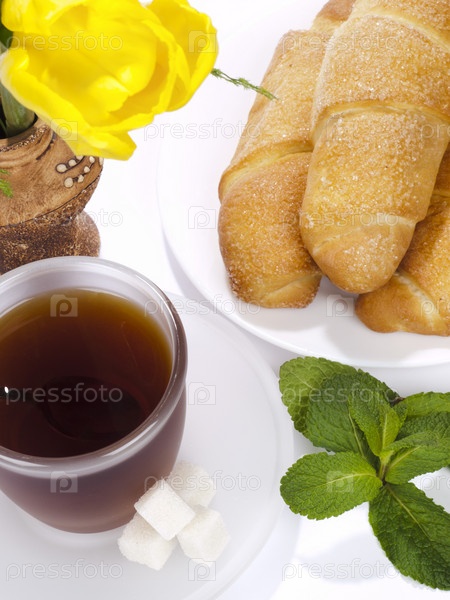 Натюрморт с чашкой чая, мятой и булочками