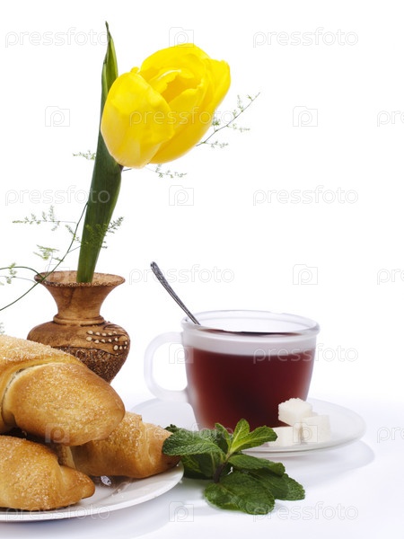 Натюрморт с чашкой чая, булочками и цветком в вазе на белом фоне