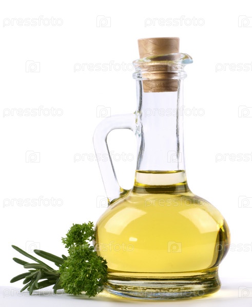 Бутылка растительного масла, розмарин и петрушка на белом фоне