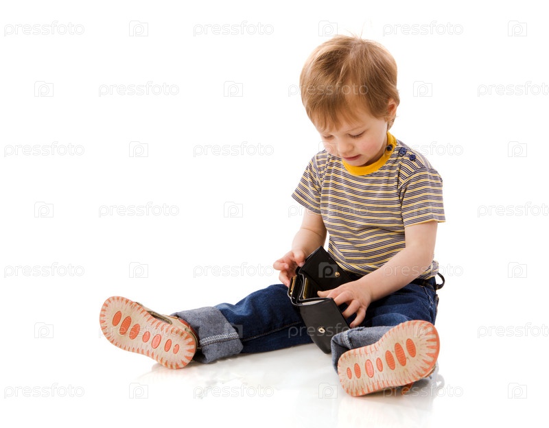 Мальчик берет деньги из кошелька родителей, изолированный на белом фоне