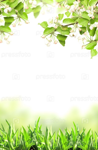 Цветущая яблоня и зеленая трава