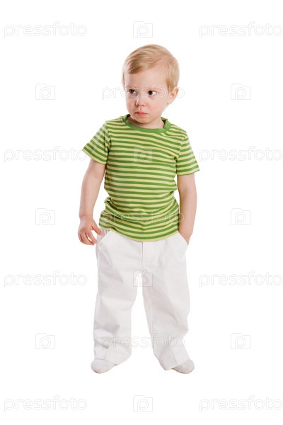Мальчик в полосатой футболке и белых брюках стоит на полу, изолированный на белом фоне
