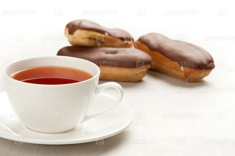 Чашка чая и эклеры с шоколадной глазурью
