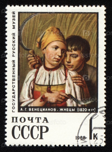 Советская марка 1968 года с изображением картины ЖНЕЦЫ художника Венецианова