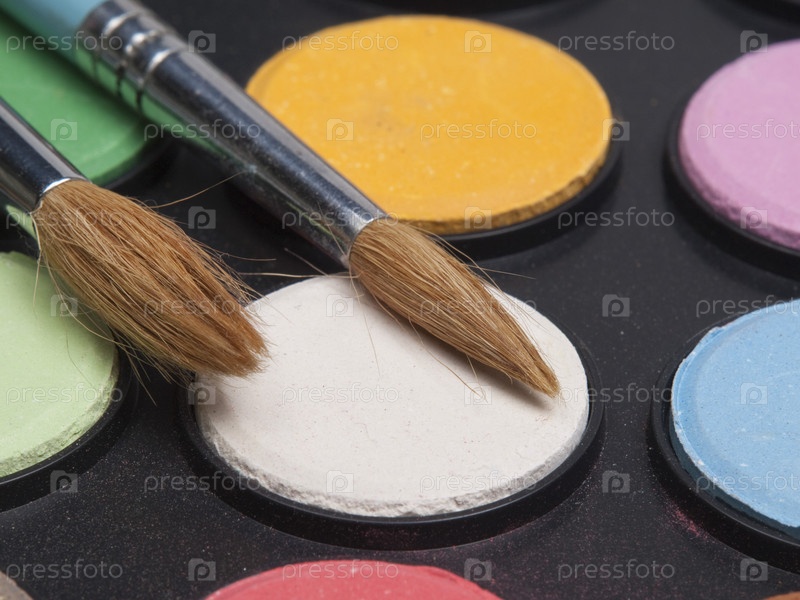 Две кисточки, лежащие на наборе красок