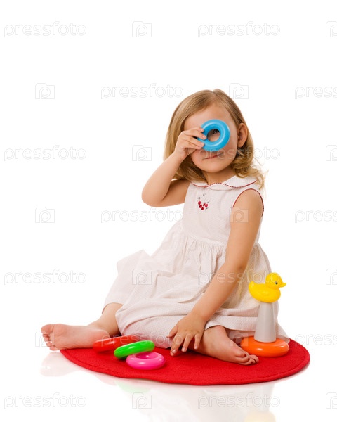 Девочка играет с пирамидой, изолированная на белом фоне