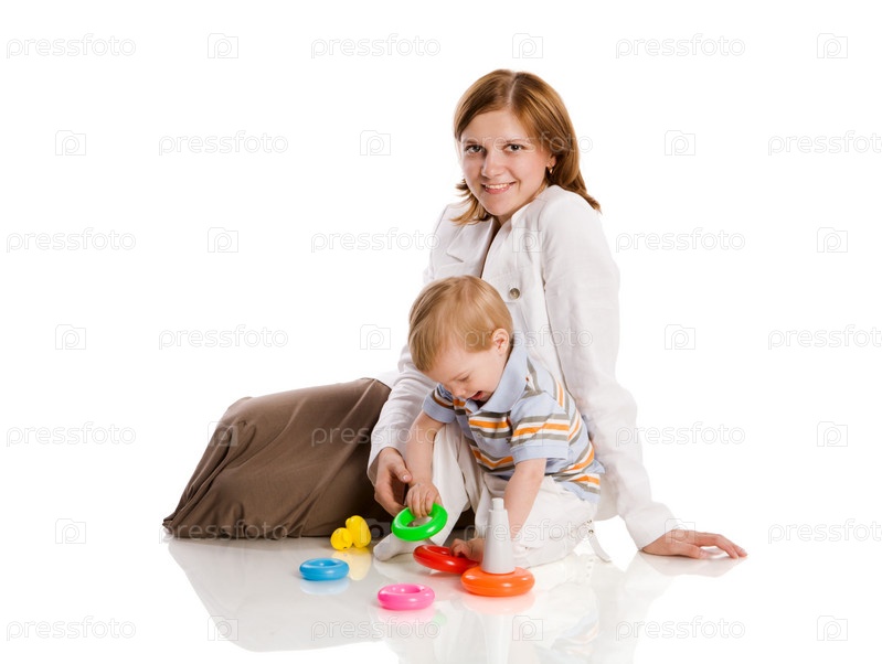 Мать с сыном позируют, изолированные на белом фоне