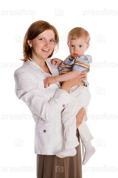 Днем веселый Мать и сын изолирован на белом