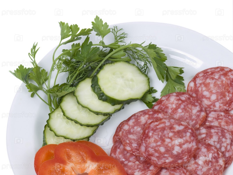 Мясная и овощная нарезка с зеленью на белом фоне
