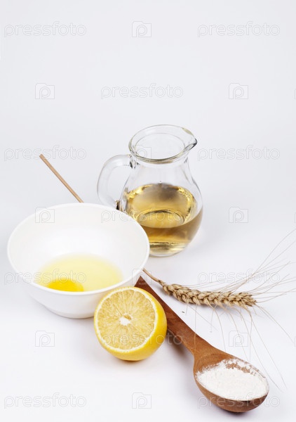 Кувшин с маслом, колос, мука и лимон на белом фоне