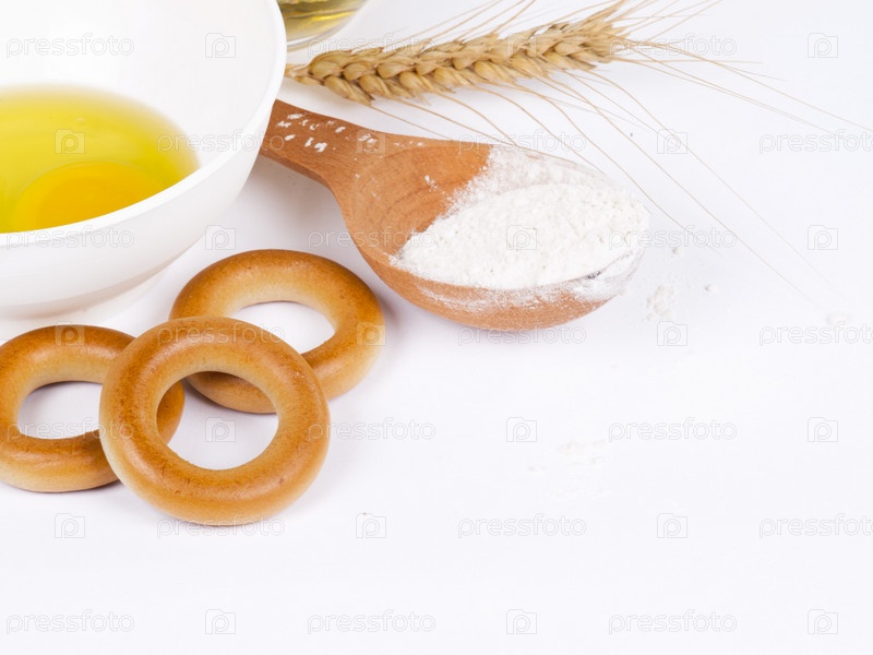 Сушки, мука и колос на белом фоне