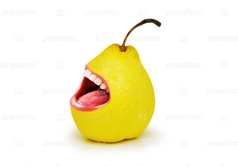 Желтая груша с открытым ртом на белом фоне