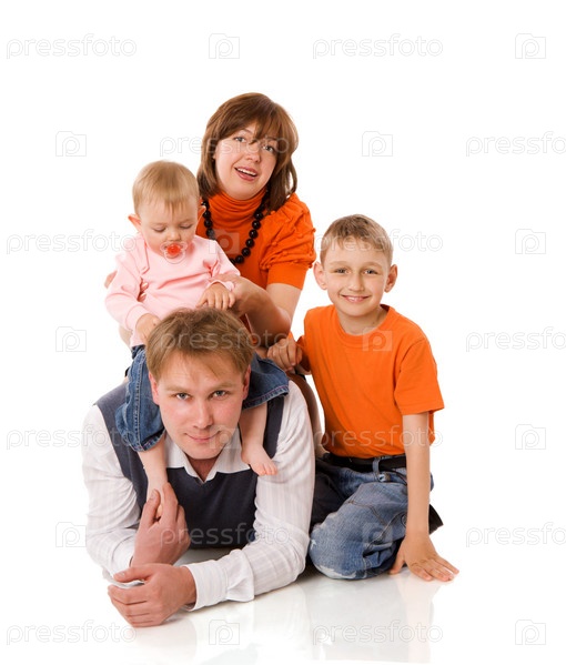 Счастливая семья с двумя детьми позируют вместе, изолированные на белом фоне