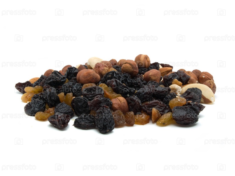 Изюм и орехи на белом фоне