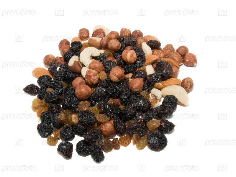 Изюм и орехи на белом фоне