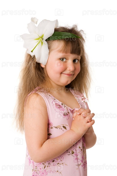 Девочка с цветком в волосах, изолированная на белом фоне