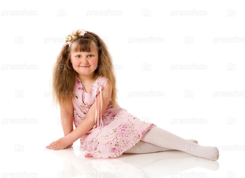 Девочка сидит на полу, изолированная на белом фоне