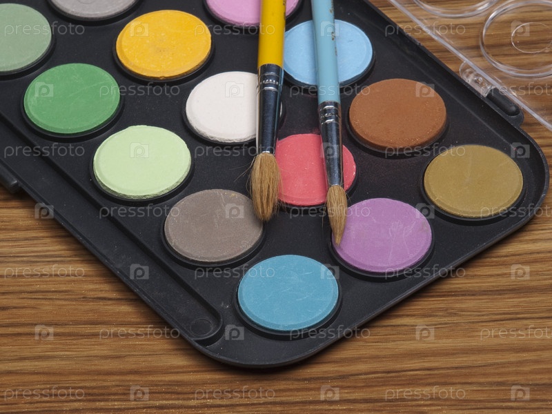 Акварельные краски и две кисти на столе