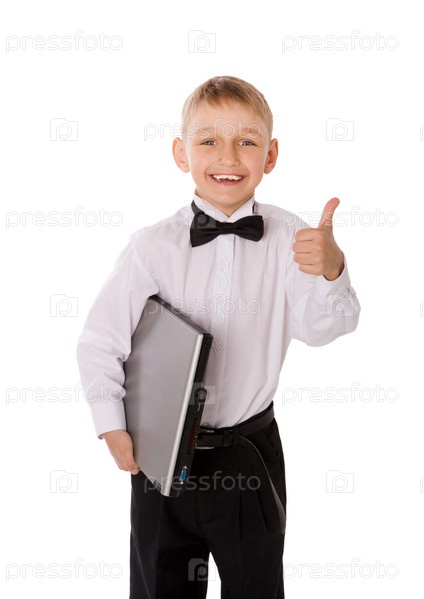 Мальчик с ноутбуком, изолированный на белом фоне