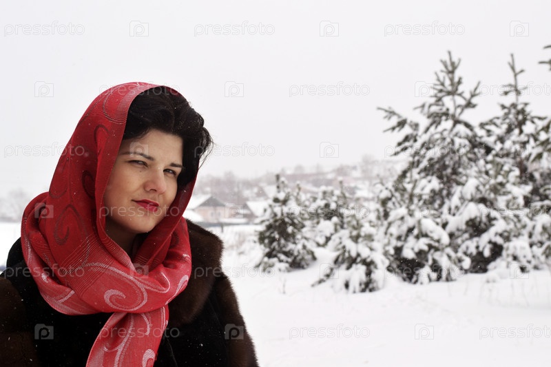 Молодая женщина в платке и шубе на фоне зимнего пейзажа