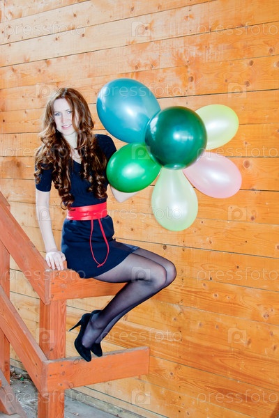 Красивая девушка с воздушными шарами в деревянном доме