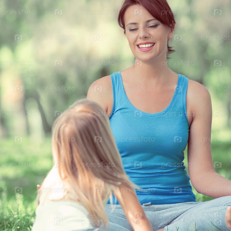 Мать и дочь делают упражнения на открытом воздухе