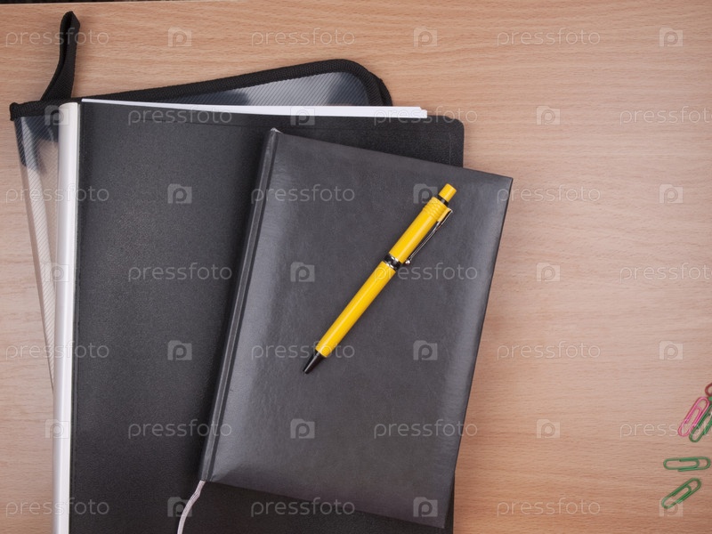 Блокнот, записная книжка, папка и ручка лежат на столе