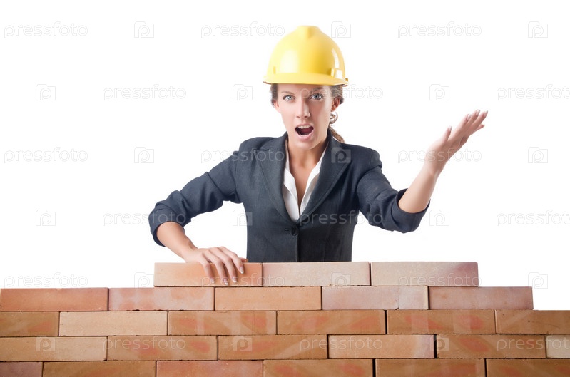 Строитель возле кирпичной стены