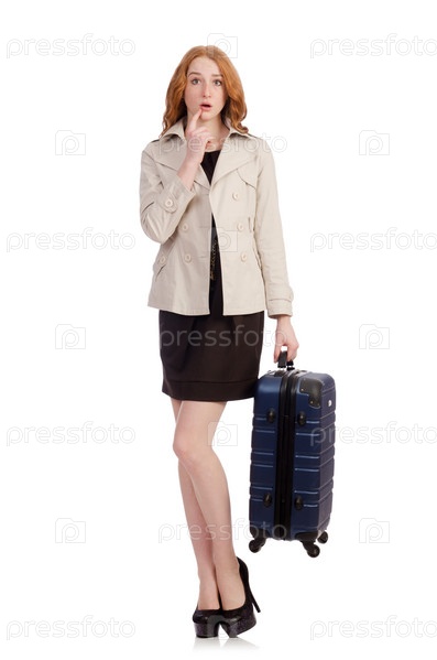 Женщина с чемоданом на белом фоне