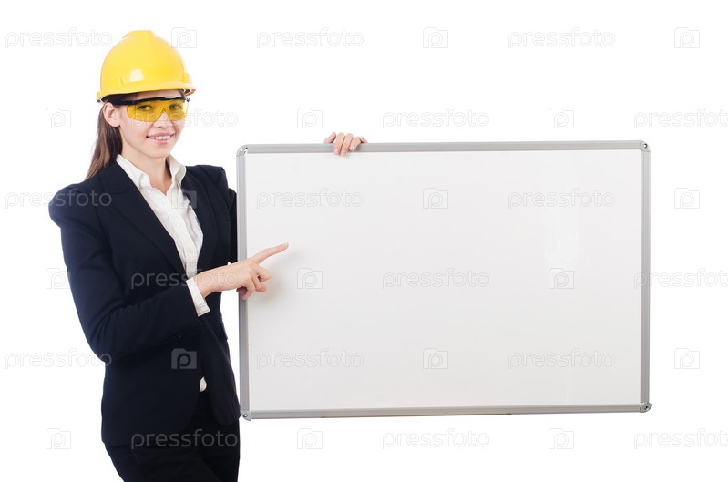 Бизнес-леди в каске с баннером