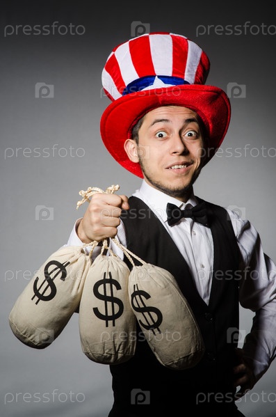 Мужчина в американской шляпе с мешками денег