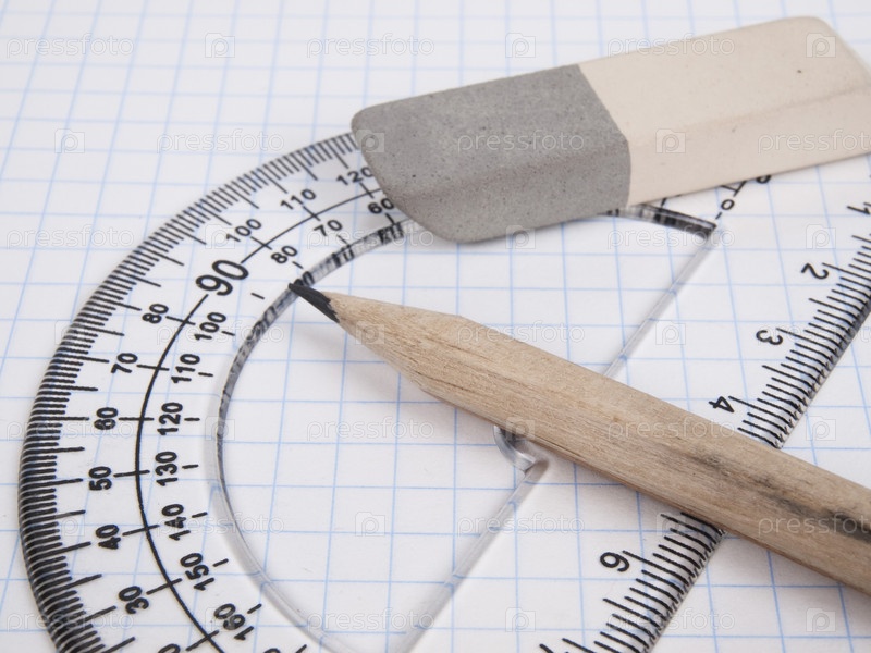Транспортир, карандаш и ластик лежат на бумаге в клетку