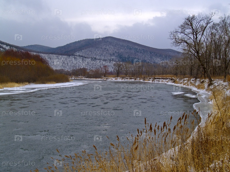 Зимний пейзаж с рекой на фоне гор