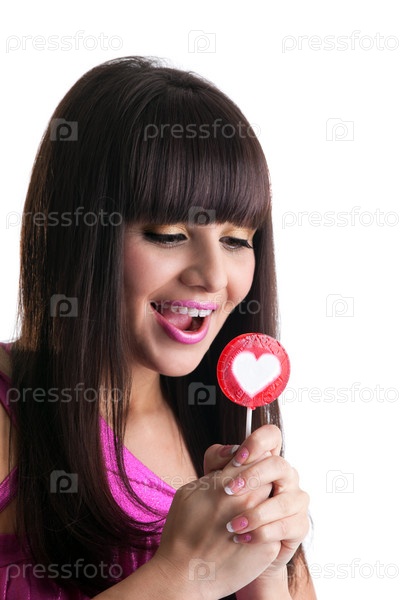 Молодая брюнетка с леденцом на палочке на белом фоне