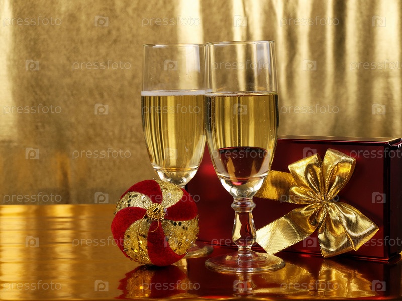 Новогодний подарок и два бокала с шампанским