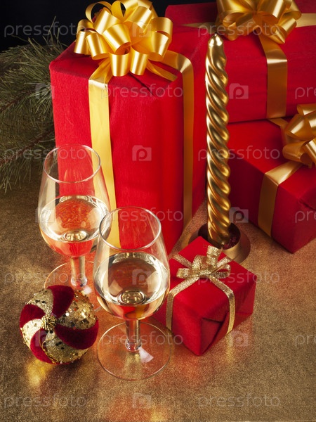 Новогодние подарки и два бокала с шампанским