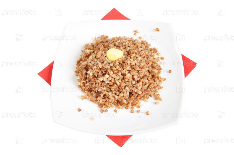 Аппетитная гречневая каша с маслом на белом фоне