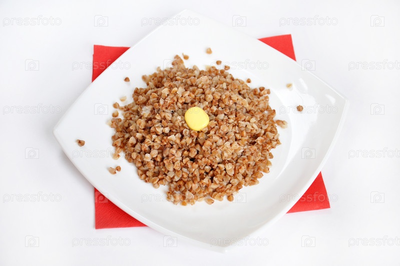 Аппетитная гречневая каша с маслом на белом фоне