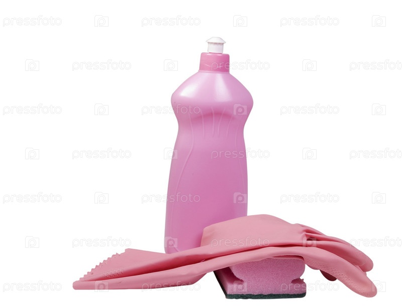 Чистящее средство, резиновые перчатки и губка на белом фоне