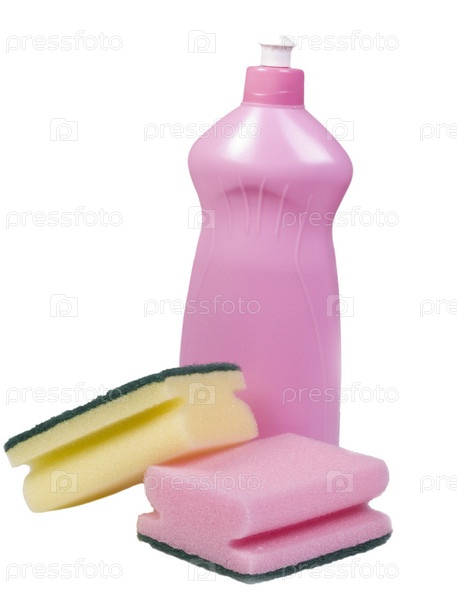 Чистящее средство и губки на белом фоне