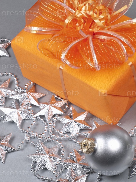 Рождественский натюрморт с украшениями и подарком