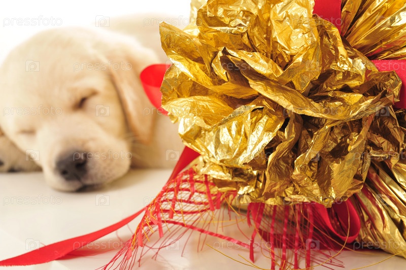 Спящий щенок лабрадора и подарок