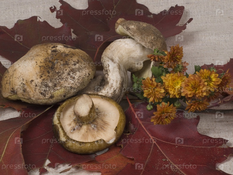 Осенний натюрморт с красными листьями и грибами