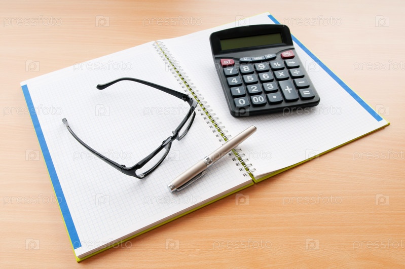 Калькулятор, тетрадь, ручка и очки на столе крупным планом