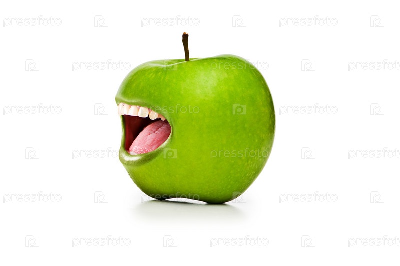 Зеленое яблоко с открытым ртом на белом фоне