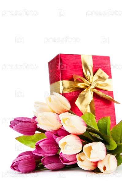 Подарок и букет тюльпанов на белом фоне крупным планом