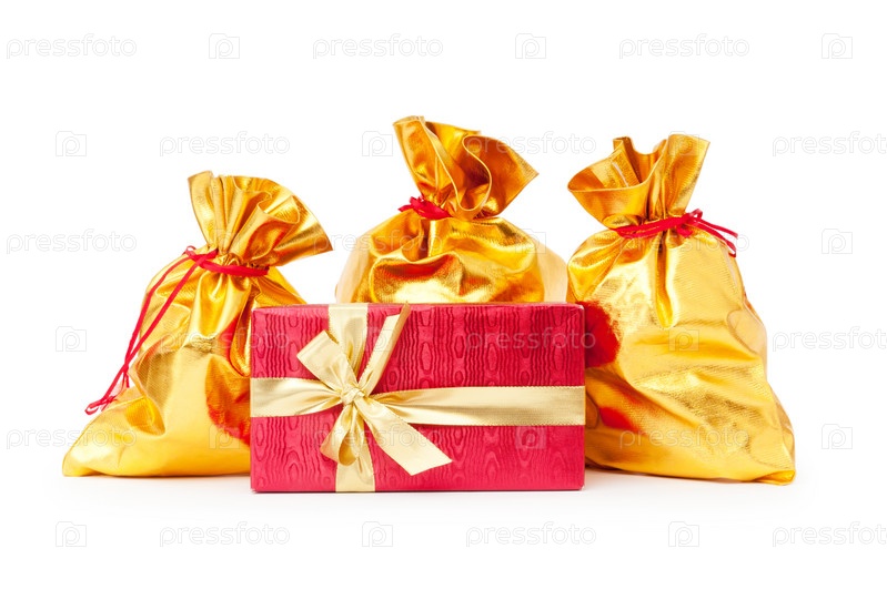 Три золотых мешка и подарок на белом фоне