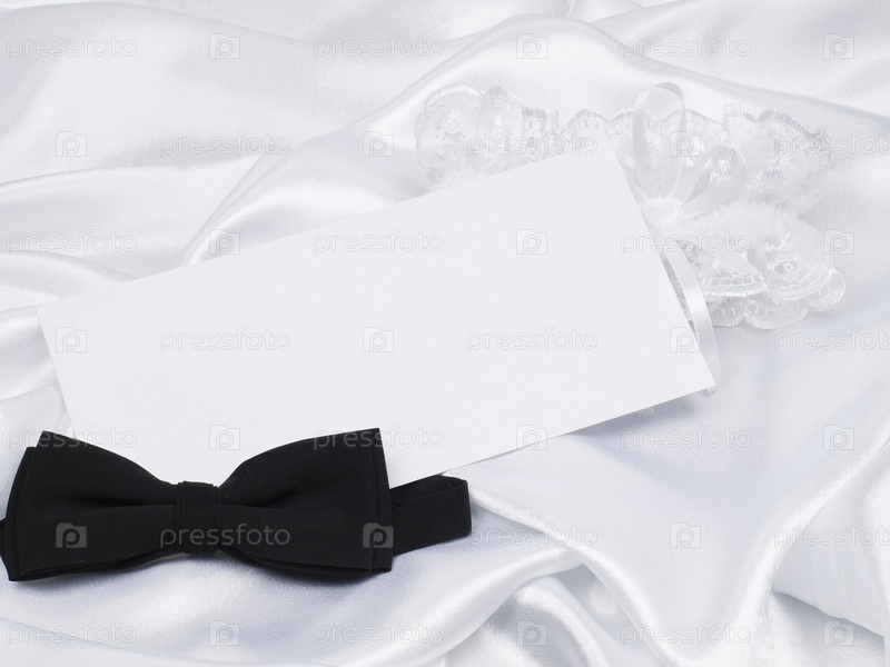 Карточка, свадебная подвязка и бабочка на фоне белого шелка